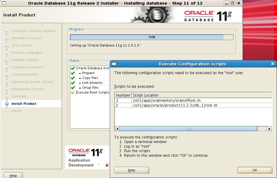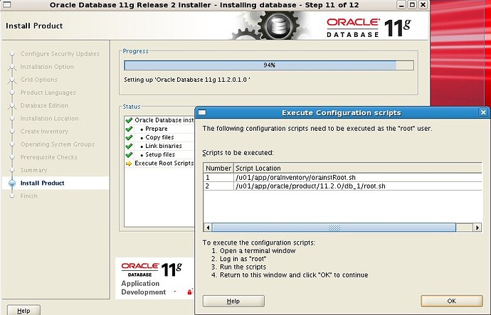 Дуусахын үед дараах зурагт харагдаж буй цонх гарч ирэх бөгөөд уг скриптүүдийг мөн root хэрэглэгчээр дарааллын дагуу ажиллуулсны дараагаар ОК дарна.