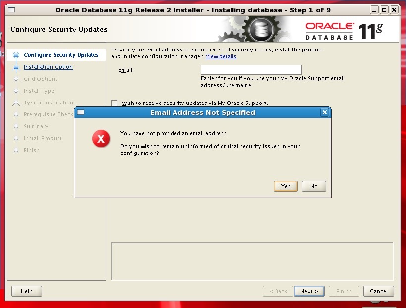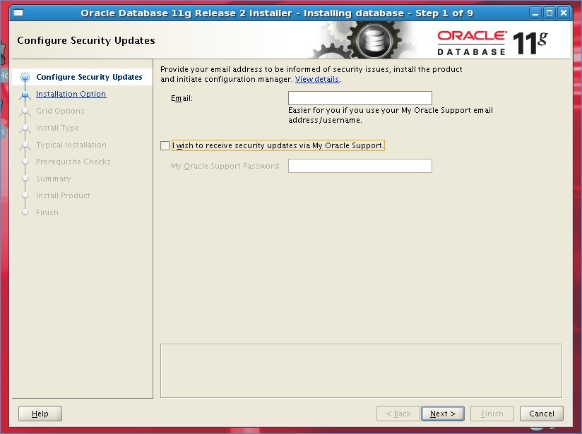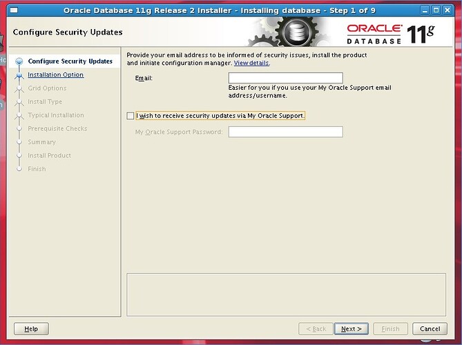 Дараах цонх гарч ирнэ. Хэрэв та лиценз аваагүй бол “I wish to receive security updates via My Oracle Support” хэсгийн сонголтийг болиулж Next дарна. Лицензтэй бол харгалзах имэйл нууц үгийг оруулаад үргэлжлүүлнэ.