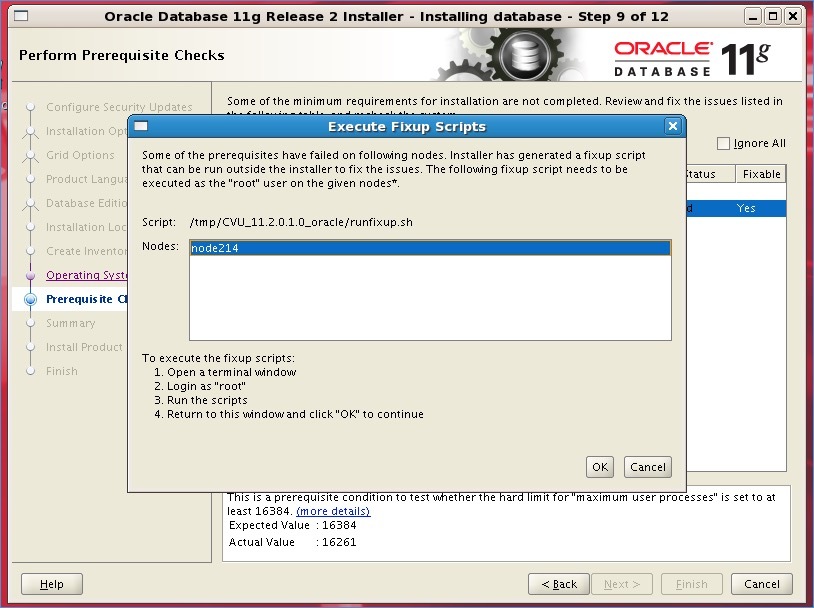 [root@node214 ~]$ /tmp/CVU_11.2.0.1.0_oracle/runfixup.sh